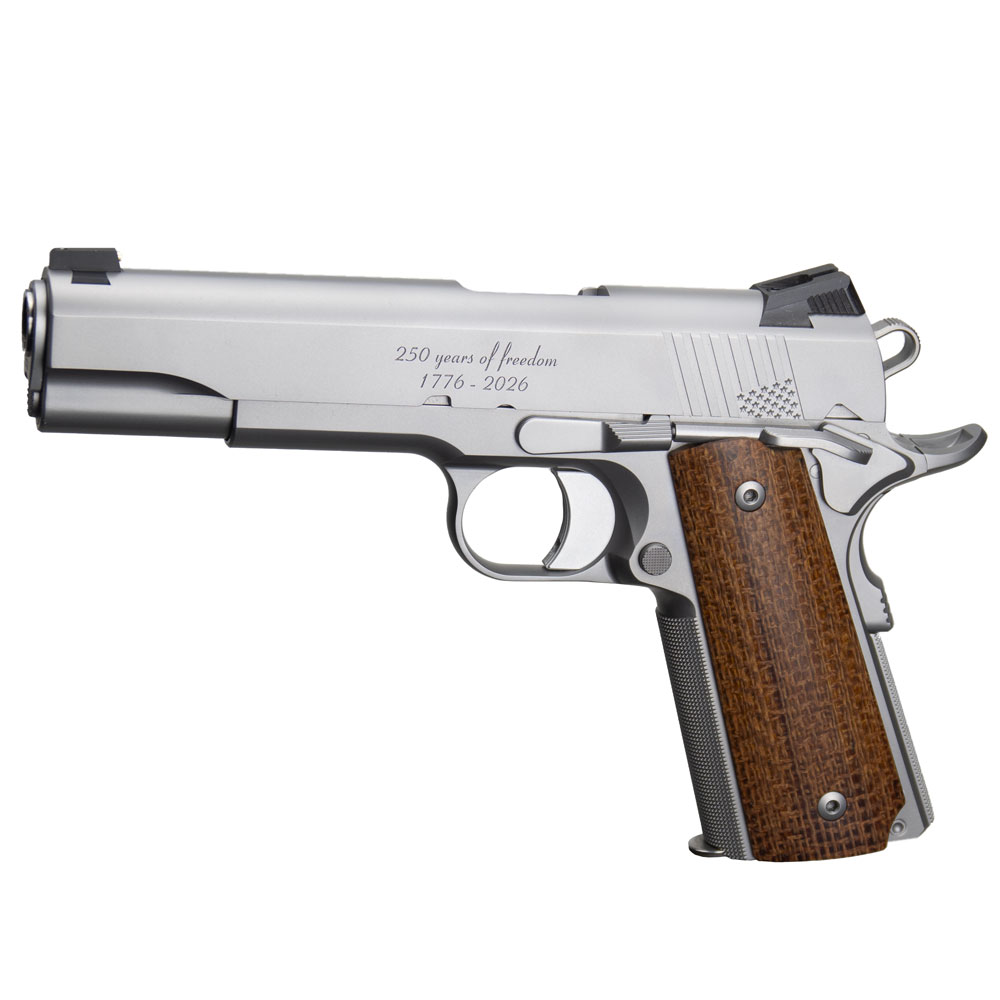 The Ed Brown 1776 Commemorative Edition is a limited-edition tribute to America's 250 years of freedom (1776–2026), chambered in .45 ACP with a classic 5" barrel. Built on a single-stack Government model frame, this premium 1911 features aggressive 25 LPI checkering on the front strap and mainspring housing, striking American flag rear cocking serrations, a plain black rear sight paired with a bold gold bead front sight, a crisp solid trigger, and hand-polished Micarta burl grips for superior feel and control. The left slide proudly bears the engraving "250 Years of Freedom 1776-2026", making this a timeless collector's piece celebrating national heritage with Ed Brown's legendary craftsmanship and precision. A true heirloom-grade 1911 for patriots and enthusiasts alike.