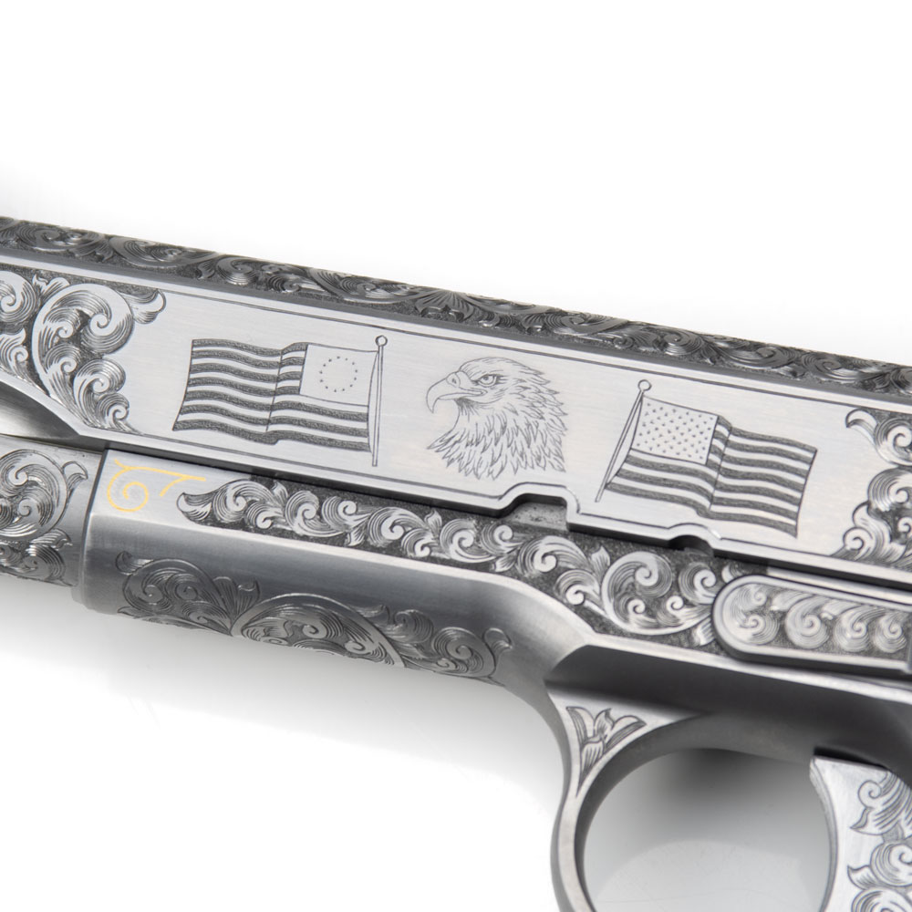 The slide incorporates American flag–inspired rear serrations, seamlessly blended into the engraving, and the top and flats are meticulously finished to maintain clarity and balance between function and ornamentation. A gold bead front sight complements a fixed black rear sight, providing both elegance and practical sight alignment.